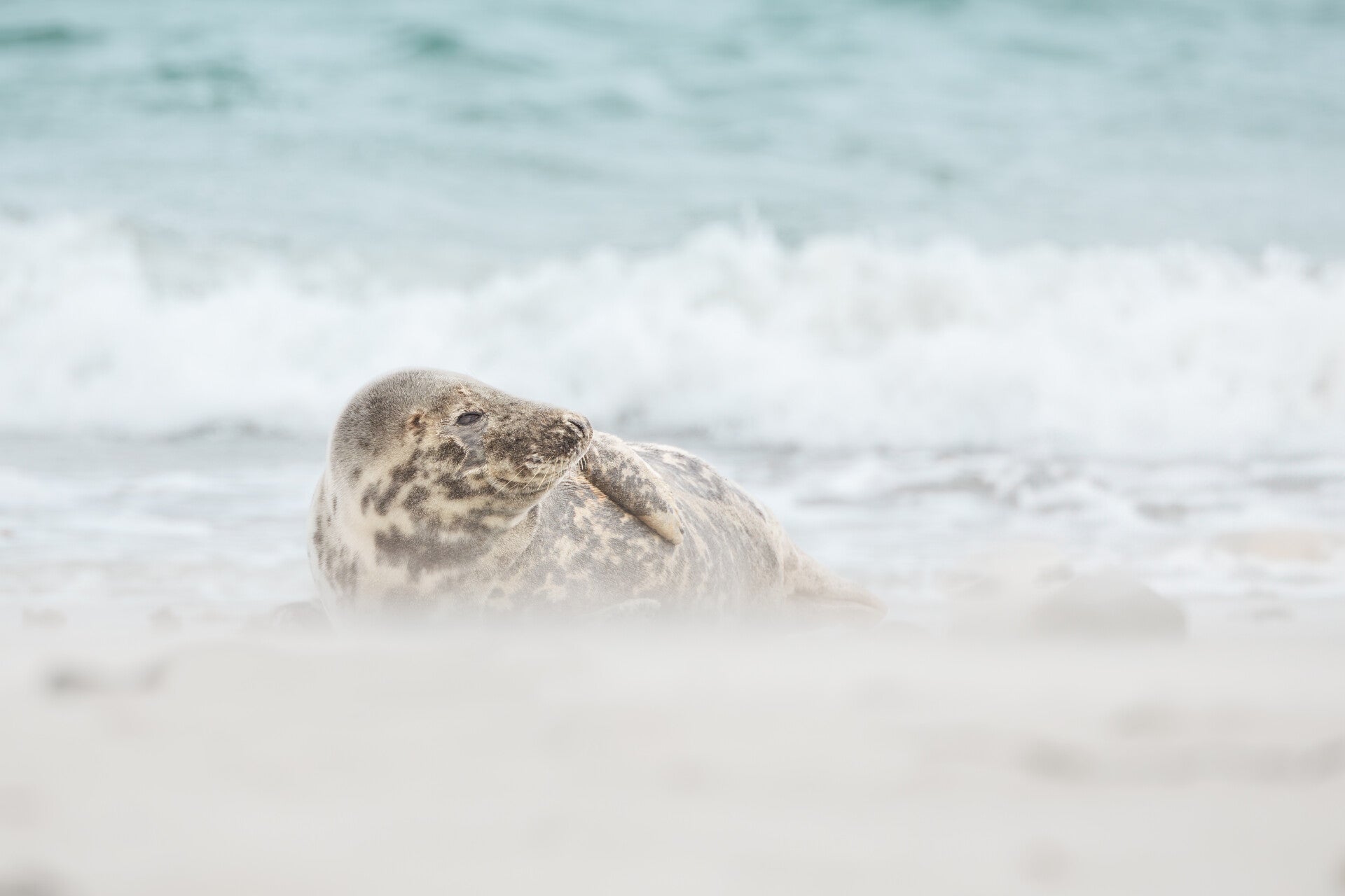 Op Helgoland kom je niet alleen maar duizenden vogels tegen, maar ook aardig wat kegelrobben en zeehonden. Met een bootje vaar je in ongeveer 10 minuten van het hoofdeiland naar het kleine eilandje Düne wat ook bij Helgoland hoort. Na de eerste stappen op het strand zag ik ze in de verte al liggen. Hier leven vooral veel kegelrobben en dit functioneert daarom zo goed, omdat mens en dier elkaar respecteren. Overal staan bordjes dat je minstens 30 meter afstand moet houden van de dieren. En dit schijnt behoorlijk goed te gaan, anders zou de populatie niet steeds groter worden op Helgoland.