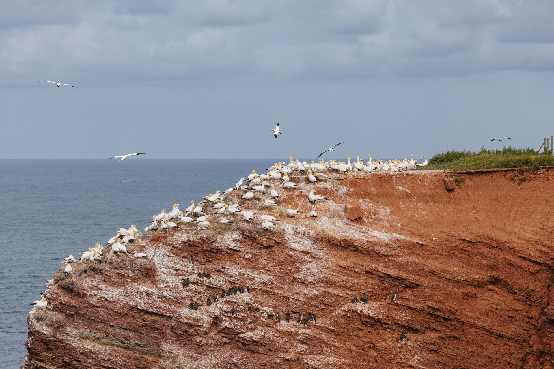 Op Helgoland aangekomen voelde ik meteen een bijzondere sfeer op het eiland. De eerste avond toen ik naar de beroemde kliffen van Helgoland liep, hoorde ik in eerste instantie nog niets. Maar naarmate ik dichterbij kwam, zag ik de eerste Jan-van-Genten vliegen en vooral werd het geluid steeds luider. Toen ik er eenmaal middenin stond moest ik er eerst even bij gaan zitten op een bankje. Genieten van het geluid, genieten van dat wat ik hier überhaupt zie. Wow, ongelovelijk. Je moet het gewoon een keer meemaken. Een kolonie met duizenden vogels. Niet alleen maar Jan-van-Genten, maar ook zeekoeten, drieteenmeeuwen en meer. Nadat ik alle indrukken had opgezogen, pakte ook ik mijn camera uit de tas en begon ik mijn eerste foto’s te maken. Normaal ben ik altijd het liefste alleen in de natuur tijdens het fotograferen, maar hier is het gewoon leuk als je naast al die andere fotografen en natuurliefhebbers staat.